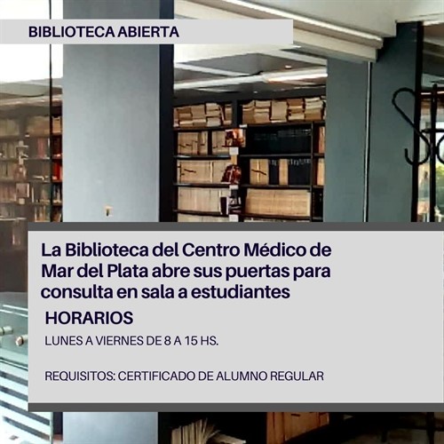 La Biblioteca del Centro Médico de Mar del Plata es una biblioteca especializada en ciencias médicas, que busca la excelencia a través de servicios bibliotecarios innovadores. Gestiona y produce información y conocimiento científico a fin de mejorar el cuidado de la salud y difunde información ágil, precisa y oportuna, hacia aquellos que investigan, toman decisiones y realizan docencia o actualización médica.